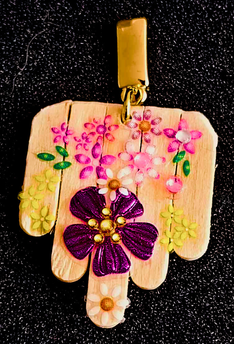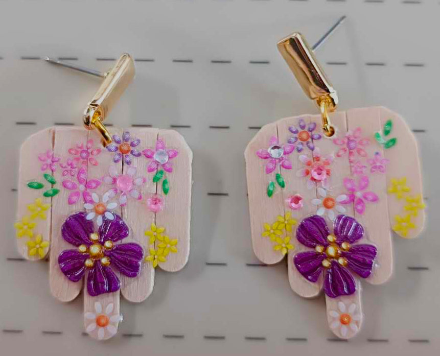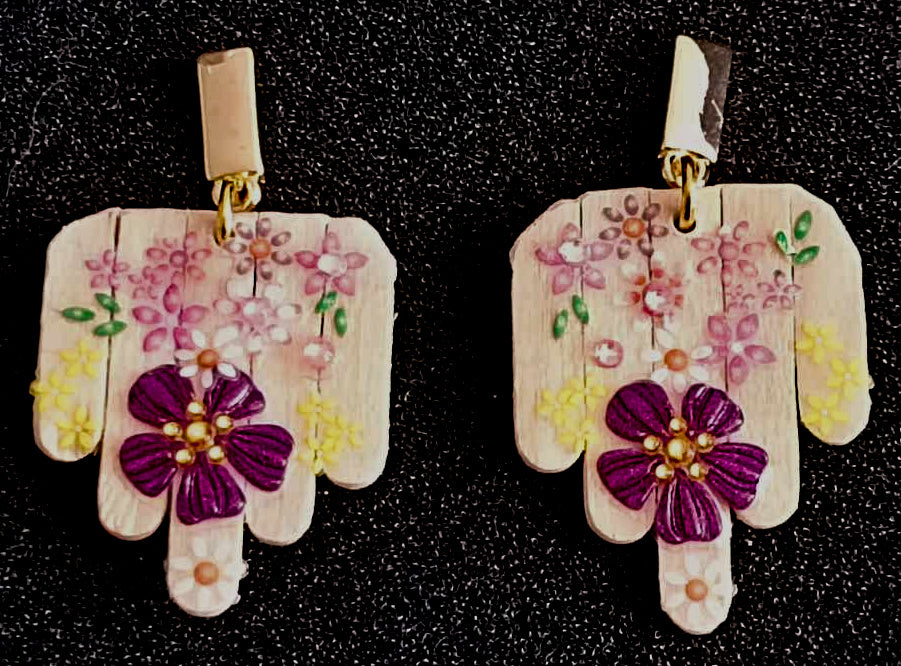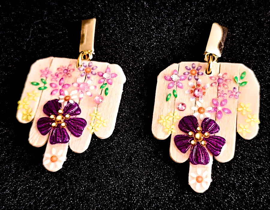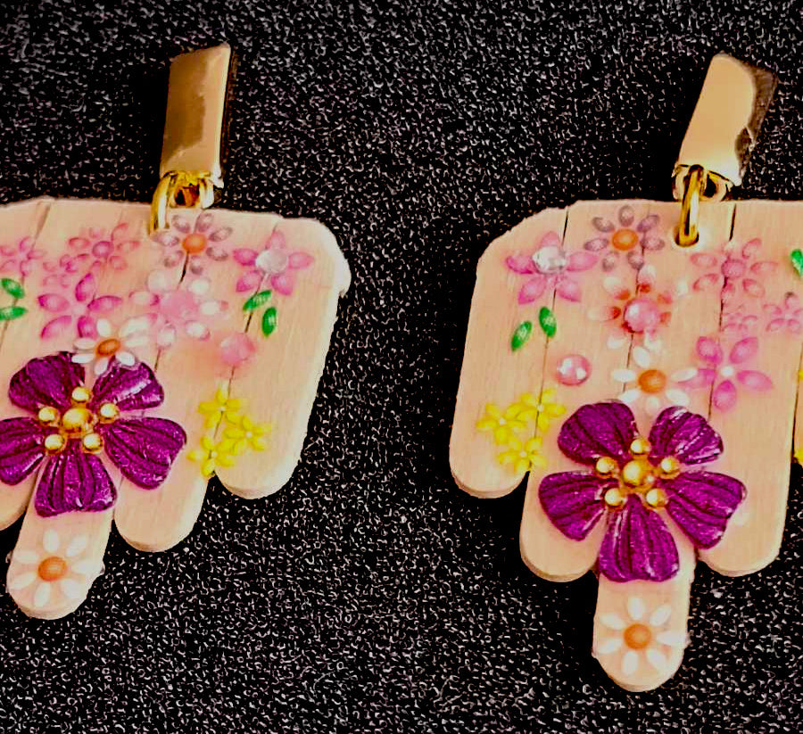 Deze opvallende oorbellen zijn een ode aan creativiteit en duurzaamheid. Het ontwerp combineert een abstracte vorm – met de hand gerecycleerd uit roerstaafjes – met natuurlijk hout en een speelse toets van bloemenstickers. De rechthoekige haakjes zijn gemaakt van hoogwaardig roestvrij staal, wat zorgt voor een moderne uitstraling en langdurig draagcomfort.