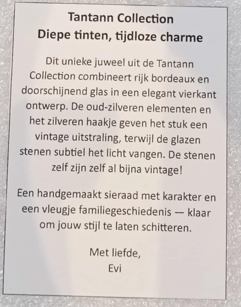 Deze oorbellen uit de Tantann-collectie stralen verfijning en elegantie uit. Diep bordeauxrode glaskralen brengen warmte en luxe, terwijl de doorzichtige glaskraal met een subtiel verwerkt bloemetje een speelse, romantische touch toevoegt. Het zilveren haakje zorgt voor een tijdloze en delicate afwerking.