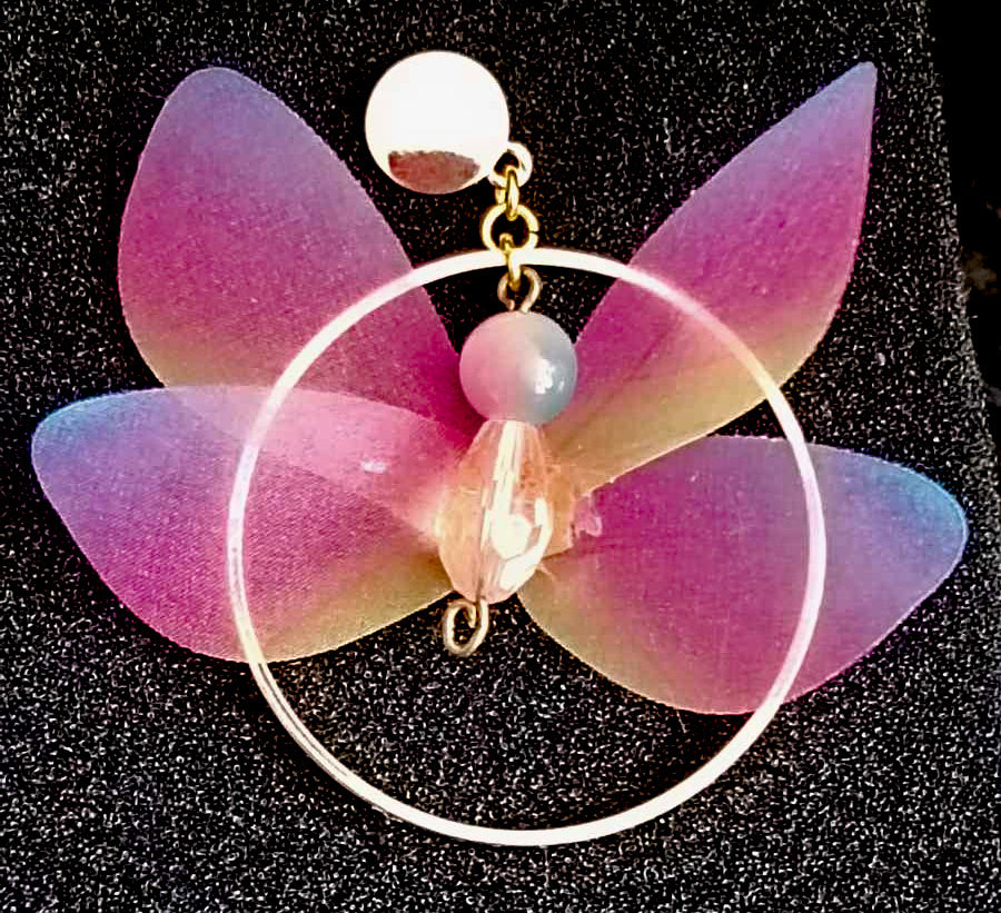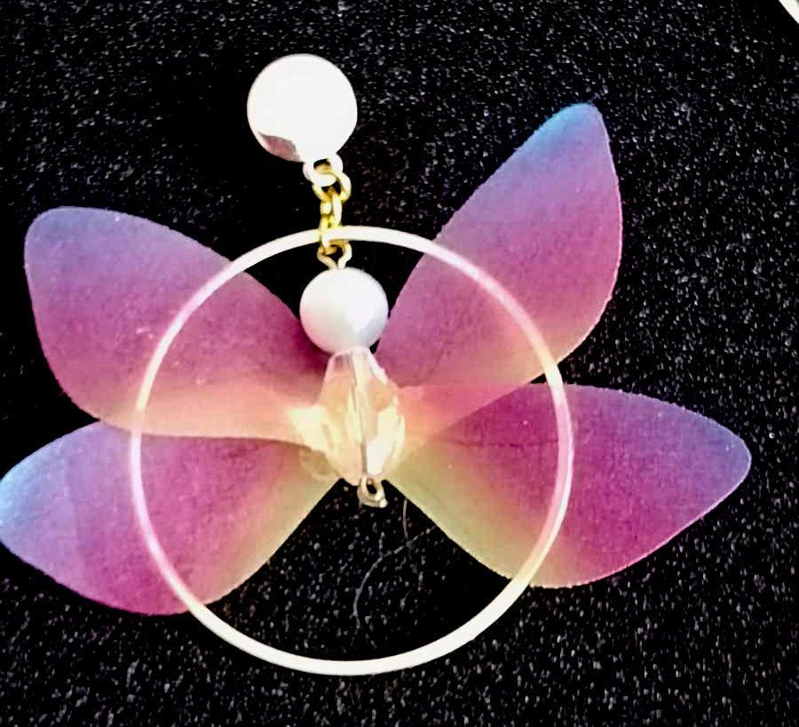 Deze elegante oorbellen zijn een ode aan verfijning en fantasie. De goudkleurige RVS steker met cirkel vormt een luxueuze basis, terwijl een delicate vlinder met doorschijnende stoffen vleugels in het midden danst. Iriserend roze glasparels maken het geheel compleet en geven het juweel een subtiele, sprookjesachtige schittering. Perfect voor wie houdt van sieraden met een dromerige, romantische uitstraling en hoogwaardige afwerking.