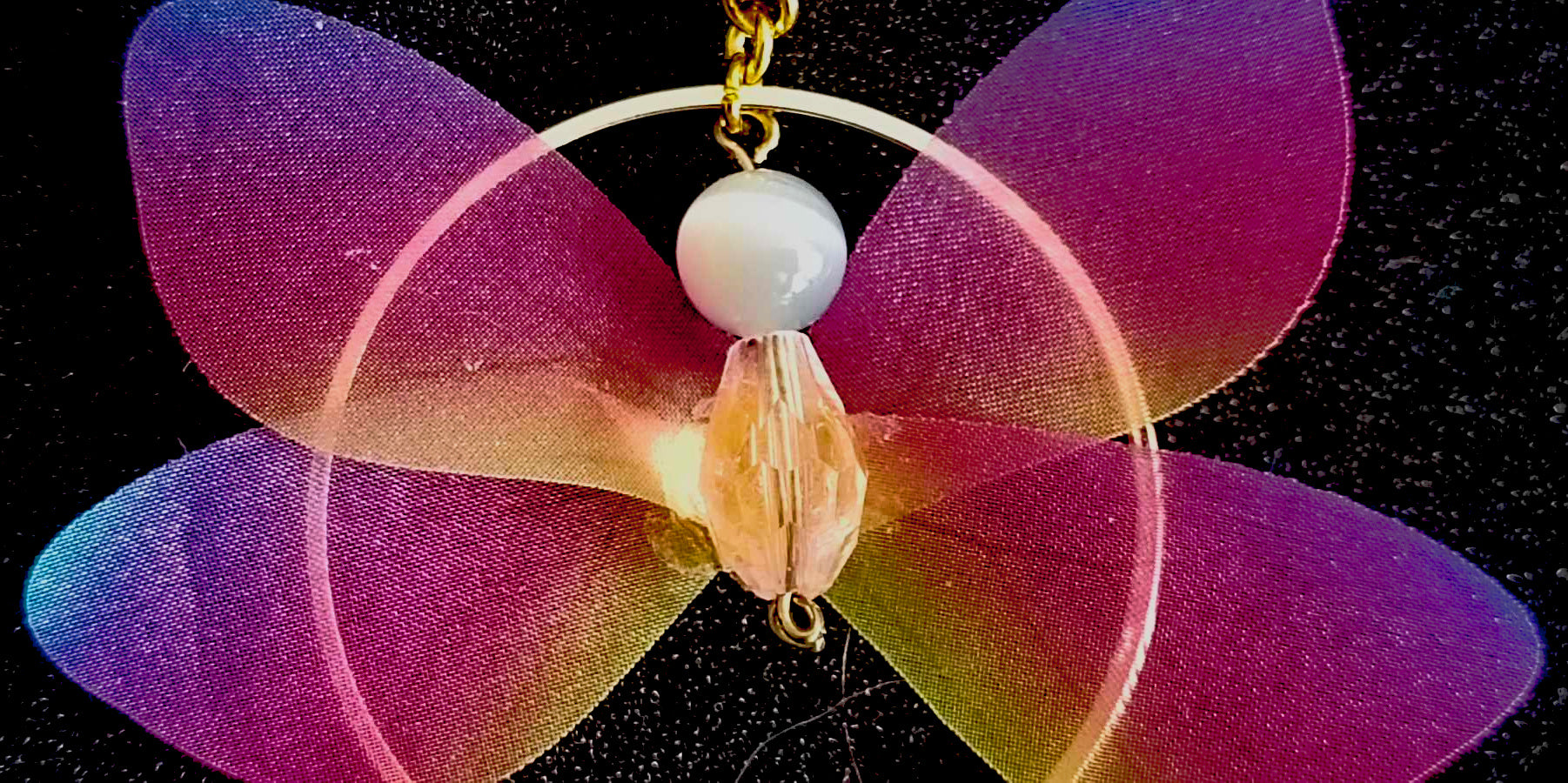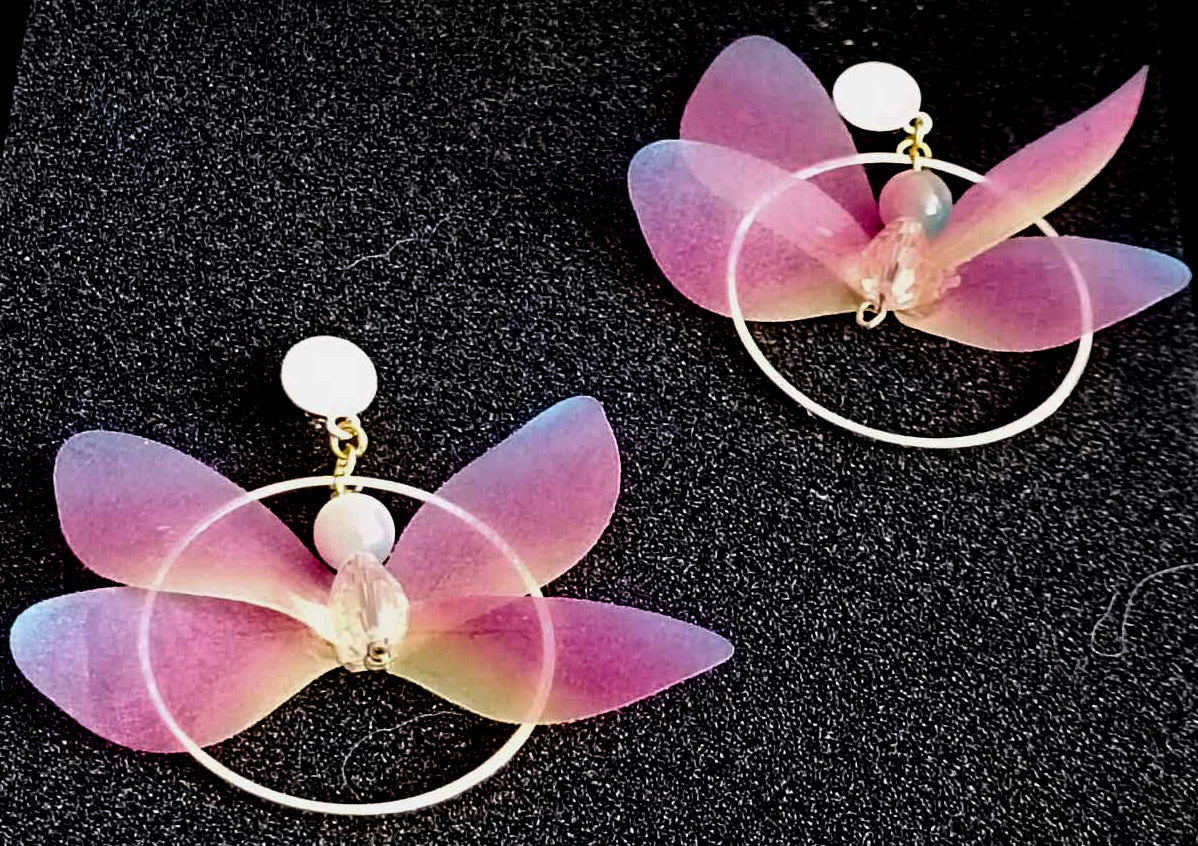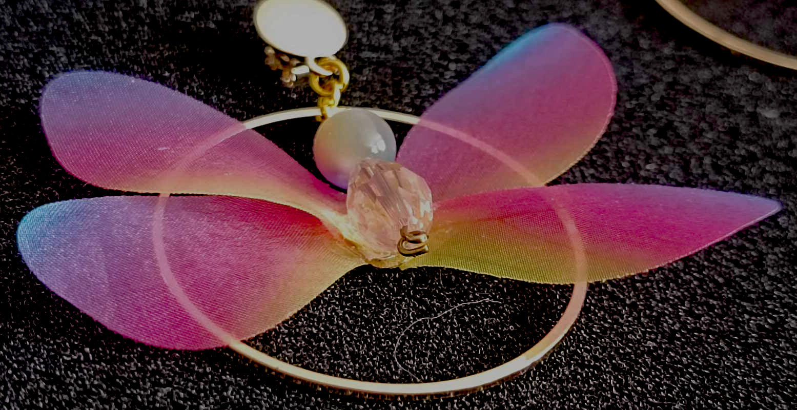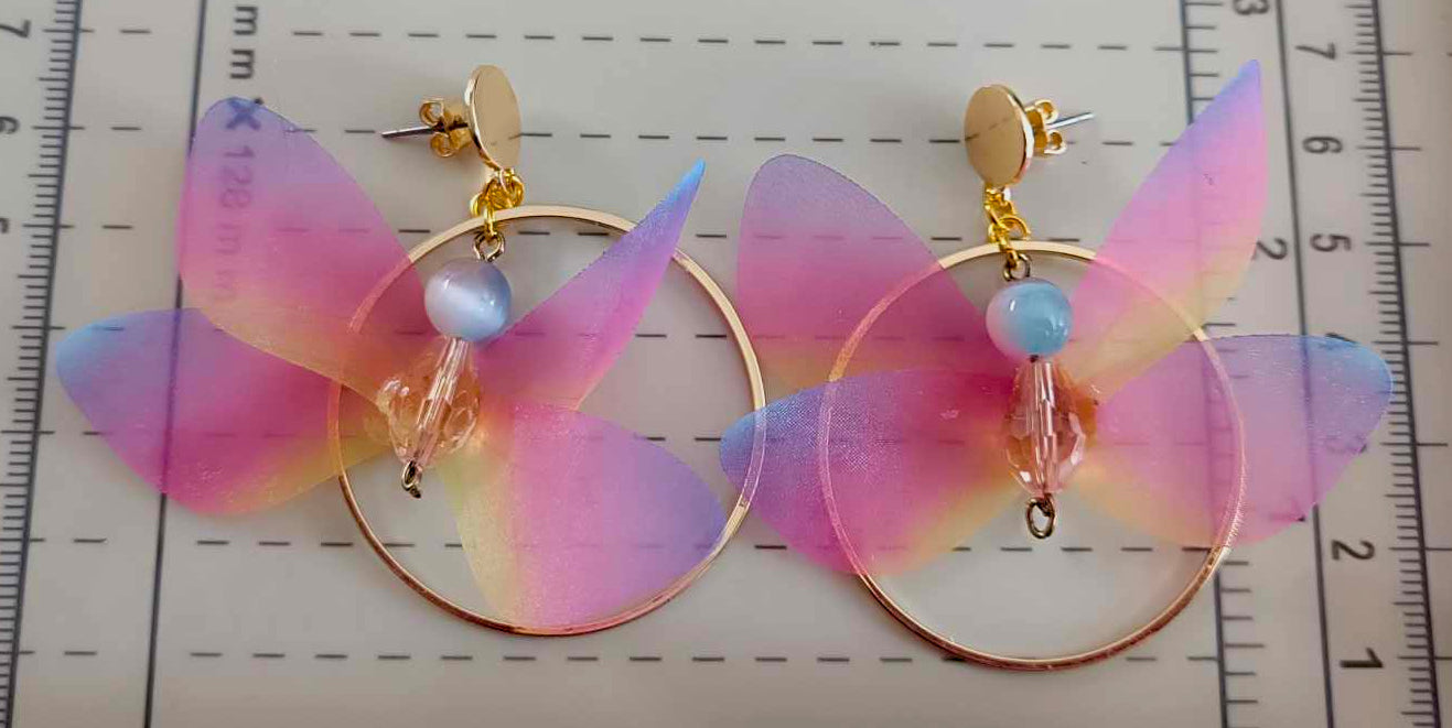 Goudkleurige Vlinder Oorbellen met Stoffen Vleugels & Roze Glasparels – Handgemaakt