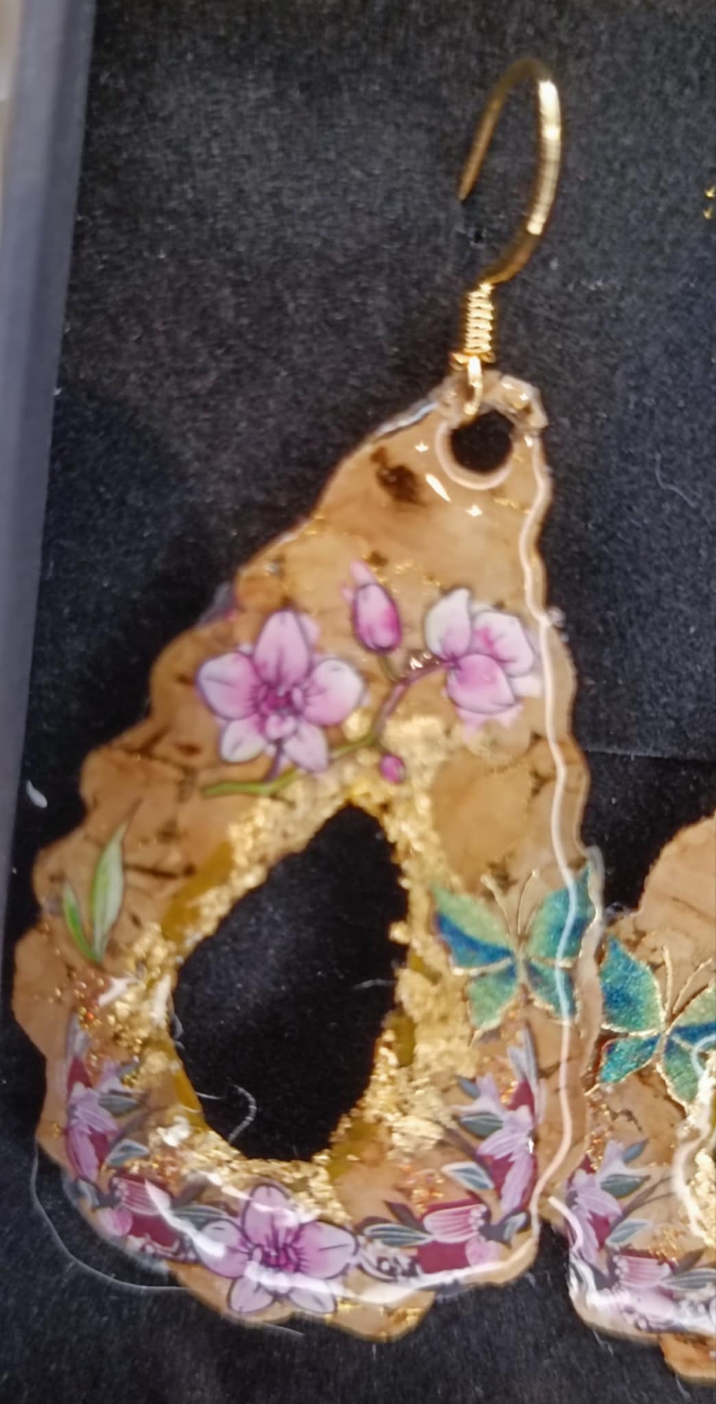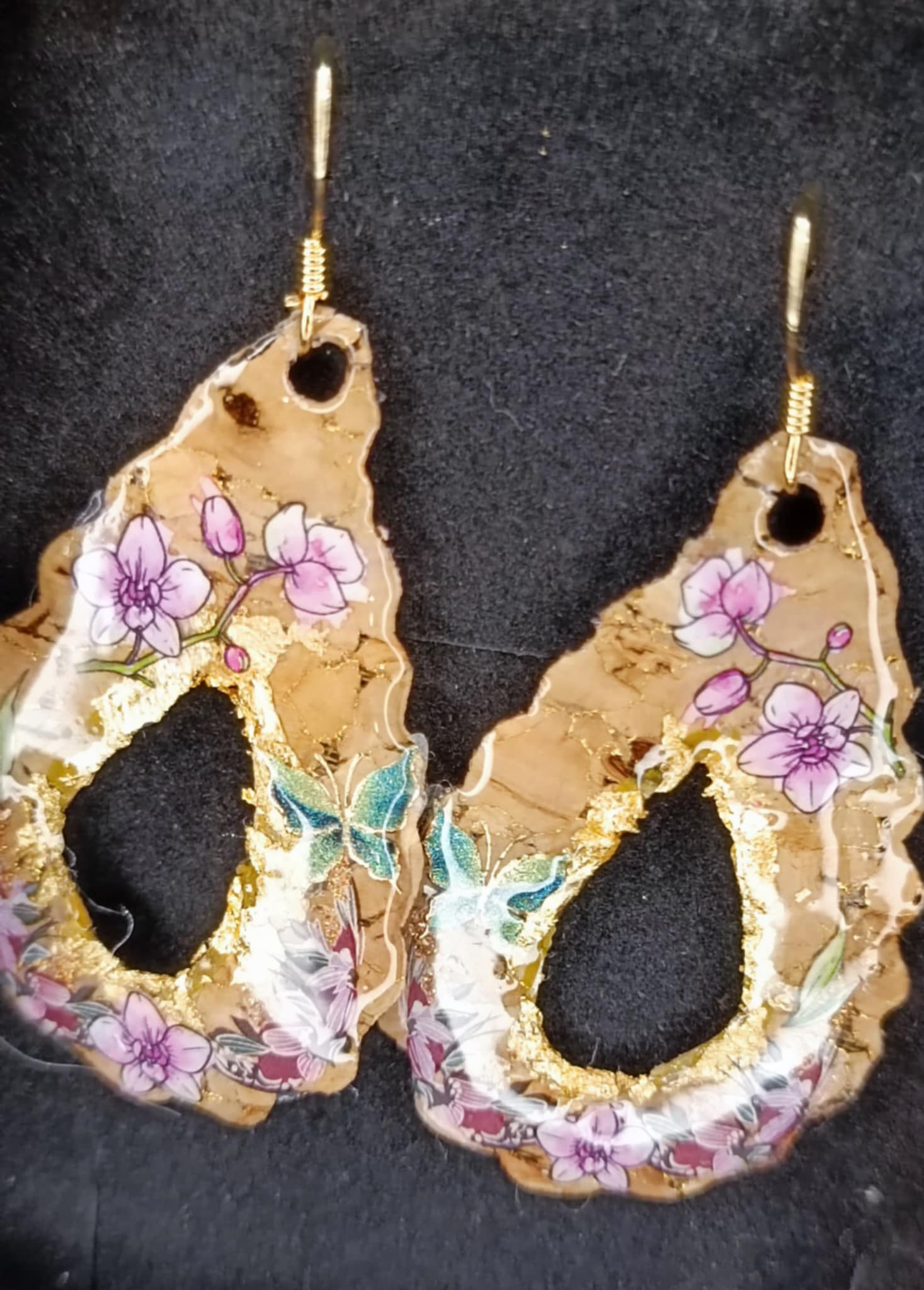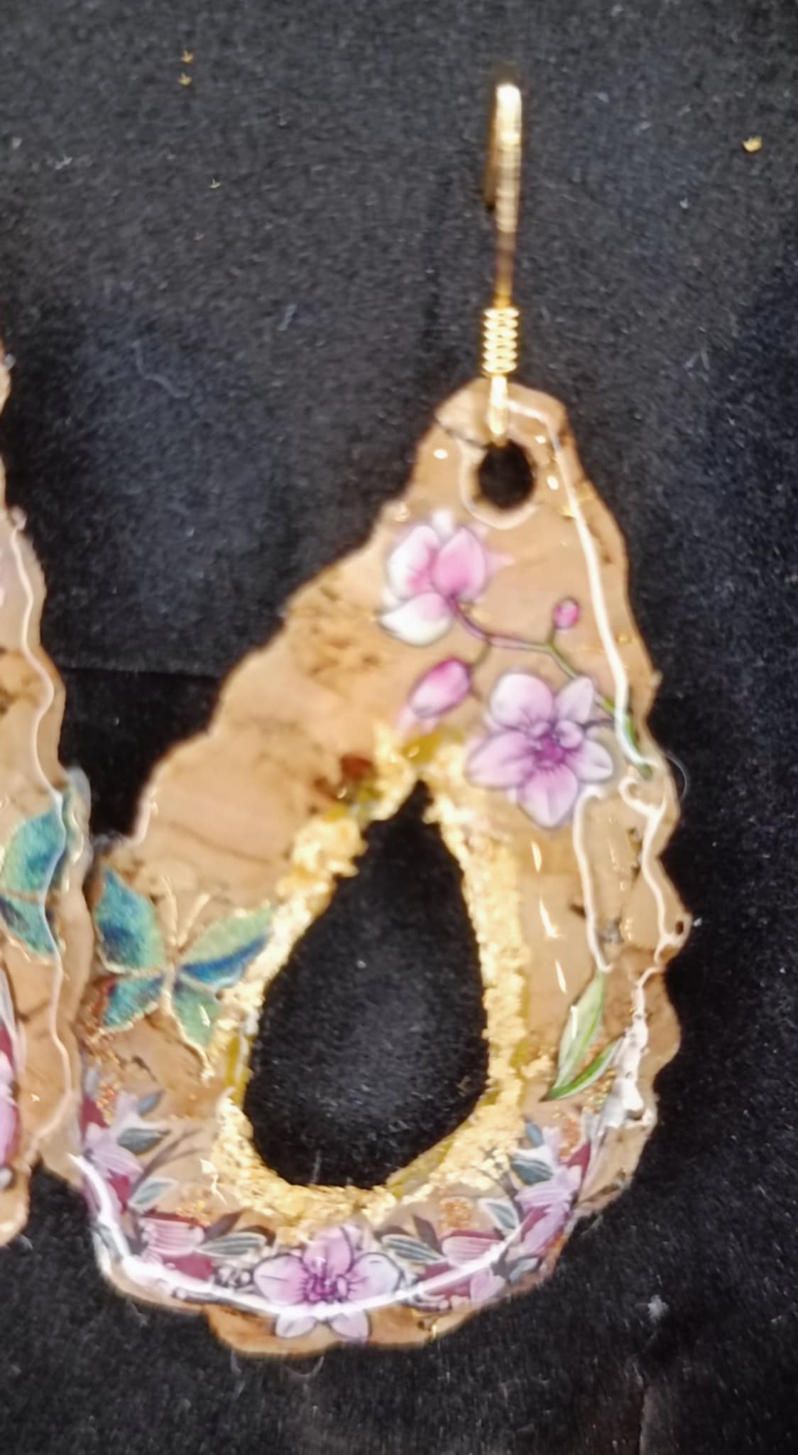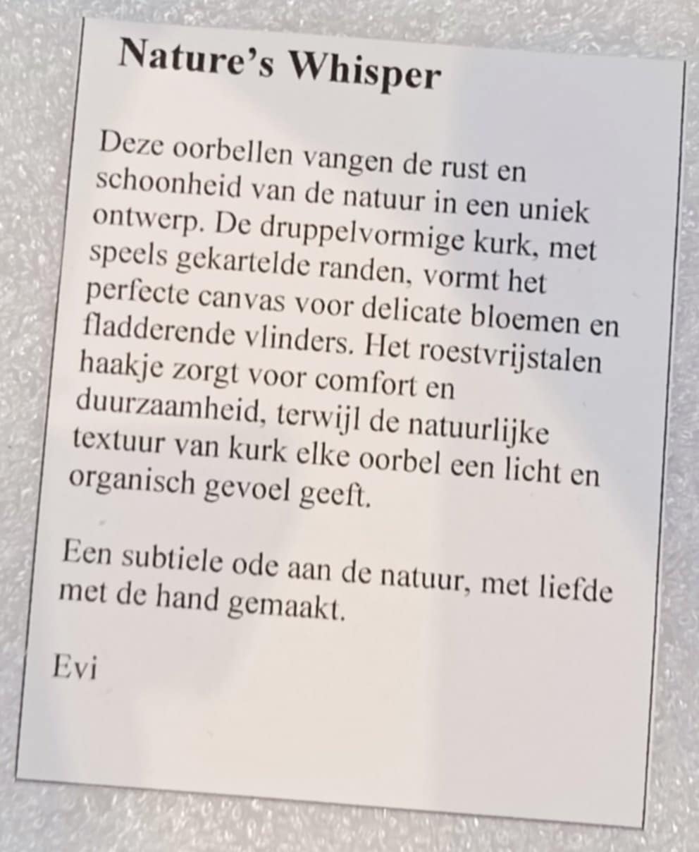 Deze oorbellen vangen de rust en schoonheid van de natuur in een uniek ontwerp. De druppelvormige kurk, met speels gekartelde randen, vormt het perfecte canvas voor delicate bloemen en fladderende vlinders. Het rvs haakje zorgt voor comfort en duurzaamheid, terwijl de natuurlijke textuur van kurk elke oorbel een licht en organisch gevoel geeft.