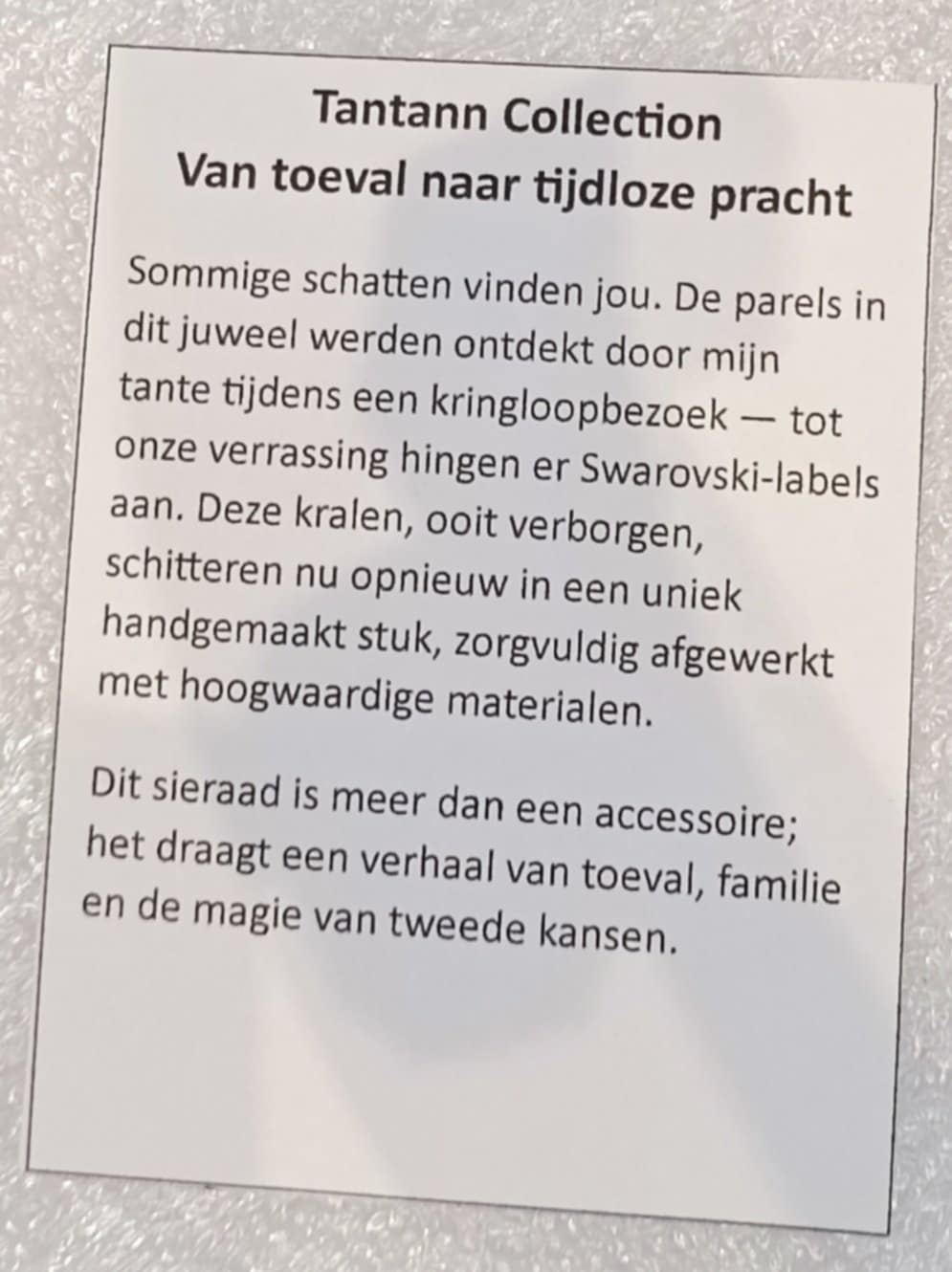 Sommige schatten vinden jou. De parels in dit juweel werden ontdekt door mijn tante tijdens een kringloopbezoek. Tot onze verassing hingen er Swarovski labels aan. Deze kralen, ooit vervorgen, schitteren nu opnieuw in een uniek handgemaakt stuk, zorgvuldig afgewerkt met hoogwaardig materiaal.
